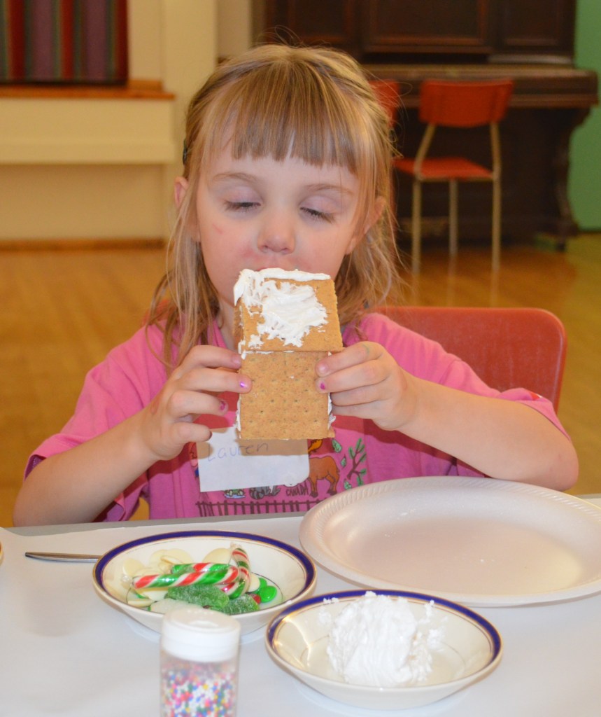 A wonderful supper was followed up by cooperative musical chairs which ended when all ten kids managed to pile on one chair! After this, the kids had a lovely time decorating gingerbread houses. Thanks to Save-On Foods for supplying the building and decorating materials.
