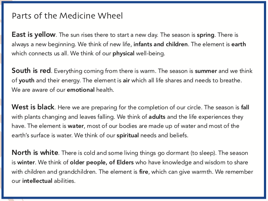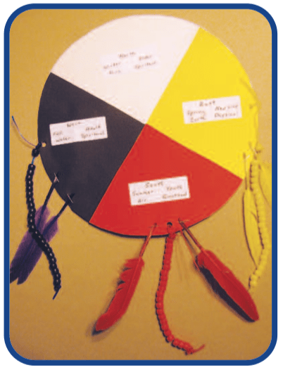 Gather in a circle. Hold up the poster of the medicine wheel. Tell the children what it is and ask them to describe it. Encourage their observations and ideas, but introduce these components: