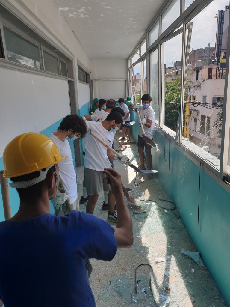 The first day 15 volunteers mainly the boys and friends went to the site for cleaning houses,& shops. They covered the broken windows, and doors with plastic and tape. They coordinated with Caritas and helped the Lebanese Red Cross to distribute food. (Caritas Lebanon strives for overall human, social & environmental development to improve the quality of life of all people in need. They are committed to helping every vulnerable person regardless of race, creed, identity or beliefs.)