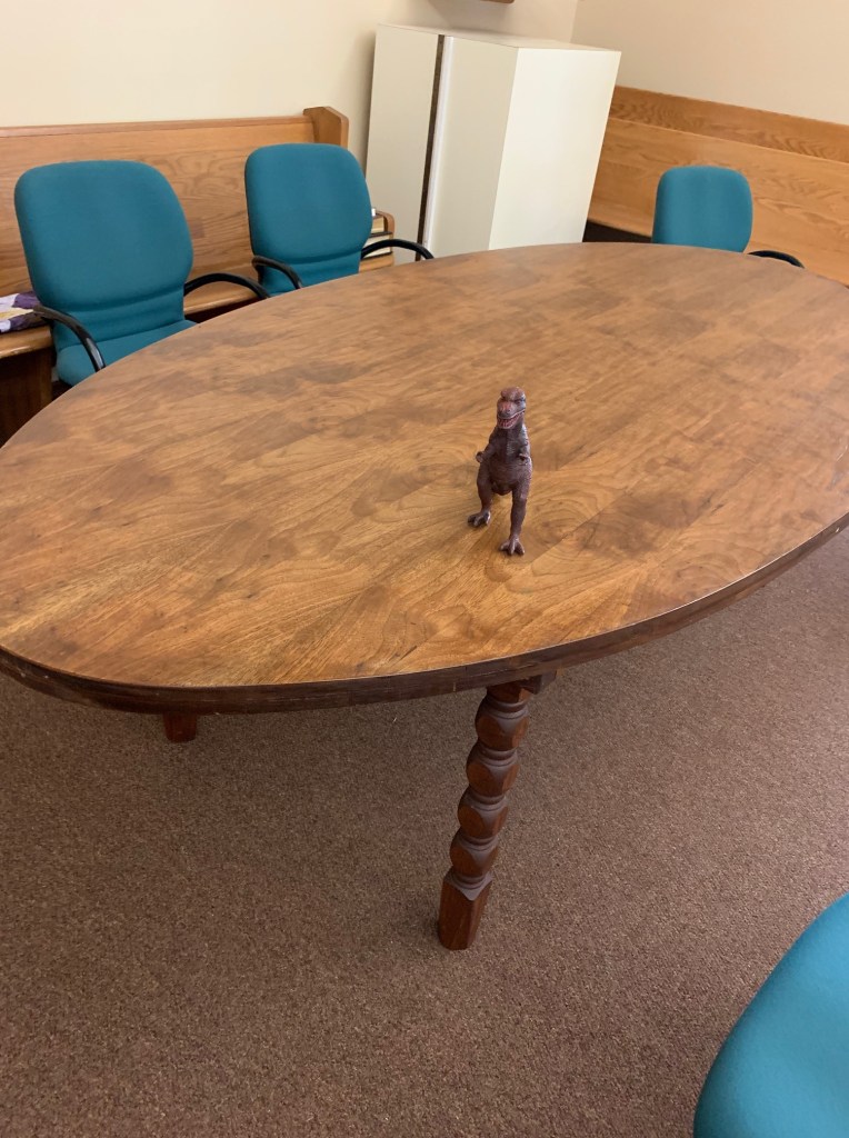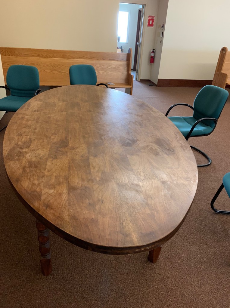 Ron and Claire hoofed the conference table (in two parts) down the stairs from the old Conference Room to it’s new home in the Chapter Room. This is a gorgeous table and it fits perfectly in the space and will be a welcome addition for meetings that occur there. It was a little tired and needed a refinish. This is where the story starts to go terribly wrong.