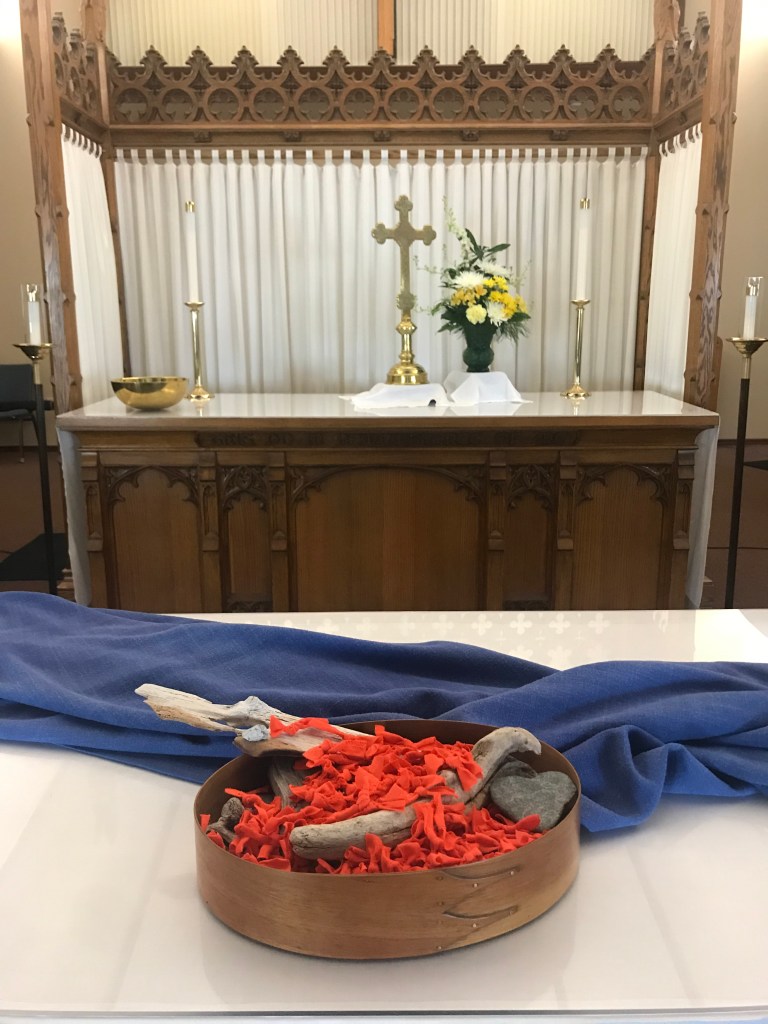 “215 orange knotted strips – small ‘forget-me-nots’; 215 tongues of flame – speaking truth and justice; 215 coals of fire – cleansing our hearts and minds of racism and all that keeps us captive; 215 swans lifting from the river in the blazing sunset – flying home”