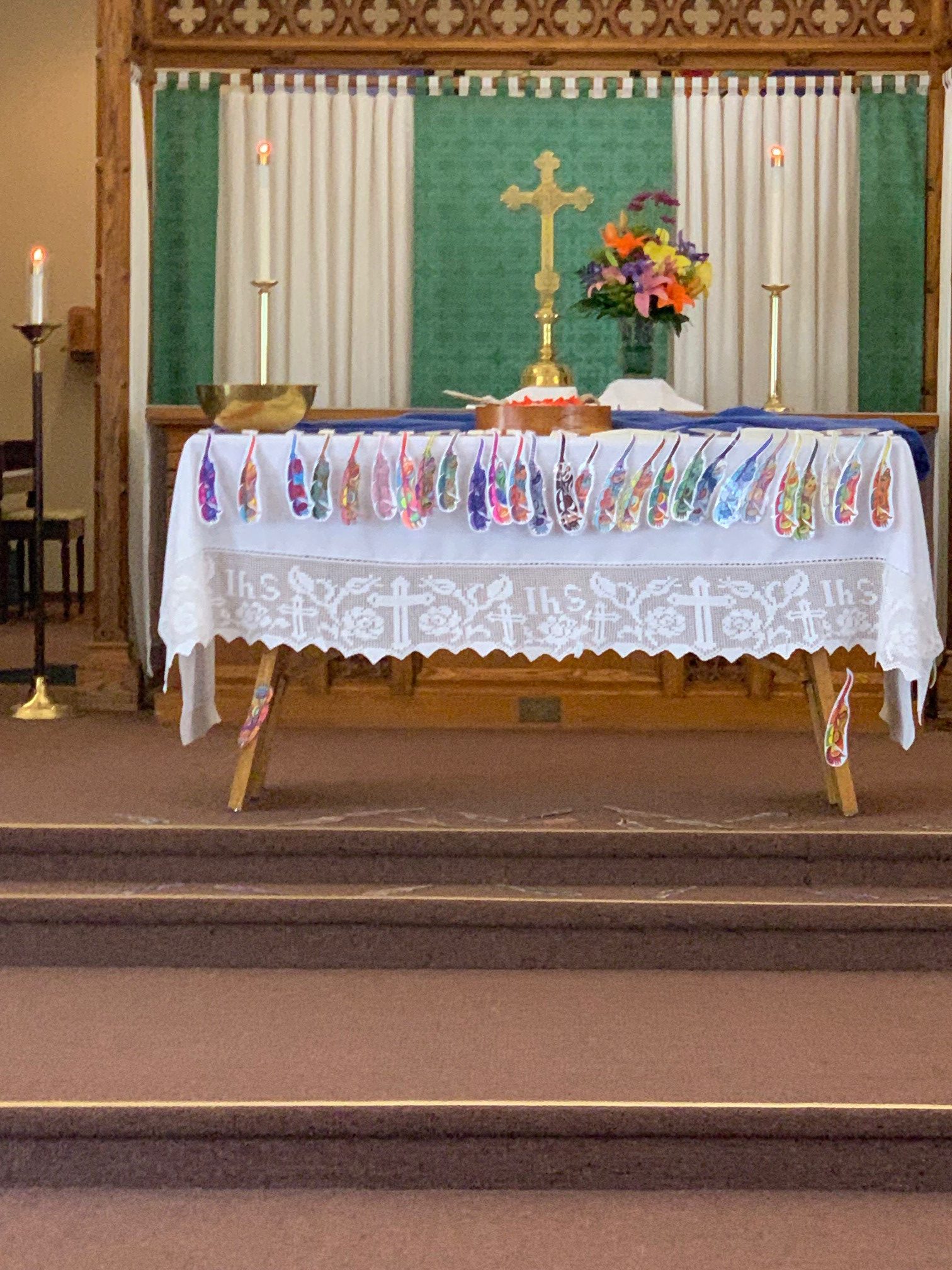 On June 3rd the members of the Cathedral were asked by Melissa Green to print and colour a feather to acknowledge and remember the discovery of the unmarked graves of 215 children at the Former Kamloops Residential School site