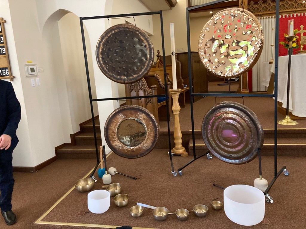 Our music director Gail Ovington arranged for the congregation to enjoy both a prelude and postlude performance of Gongs by Rob Gretsinger which he called a soundscape mediation. What a beautiful experience!