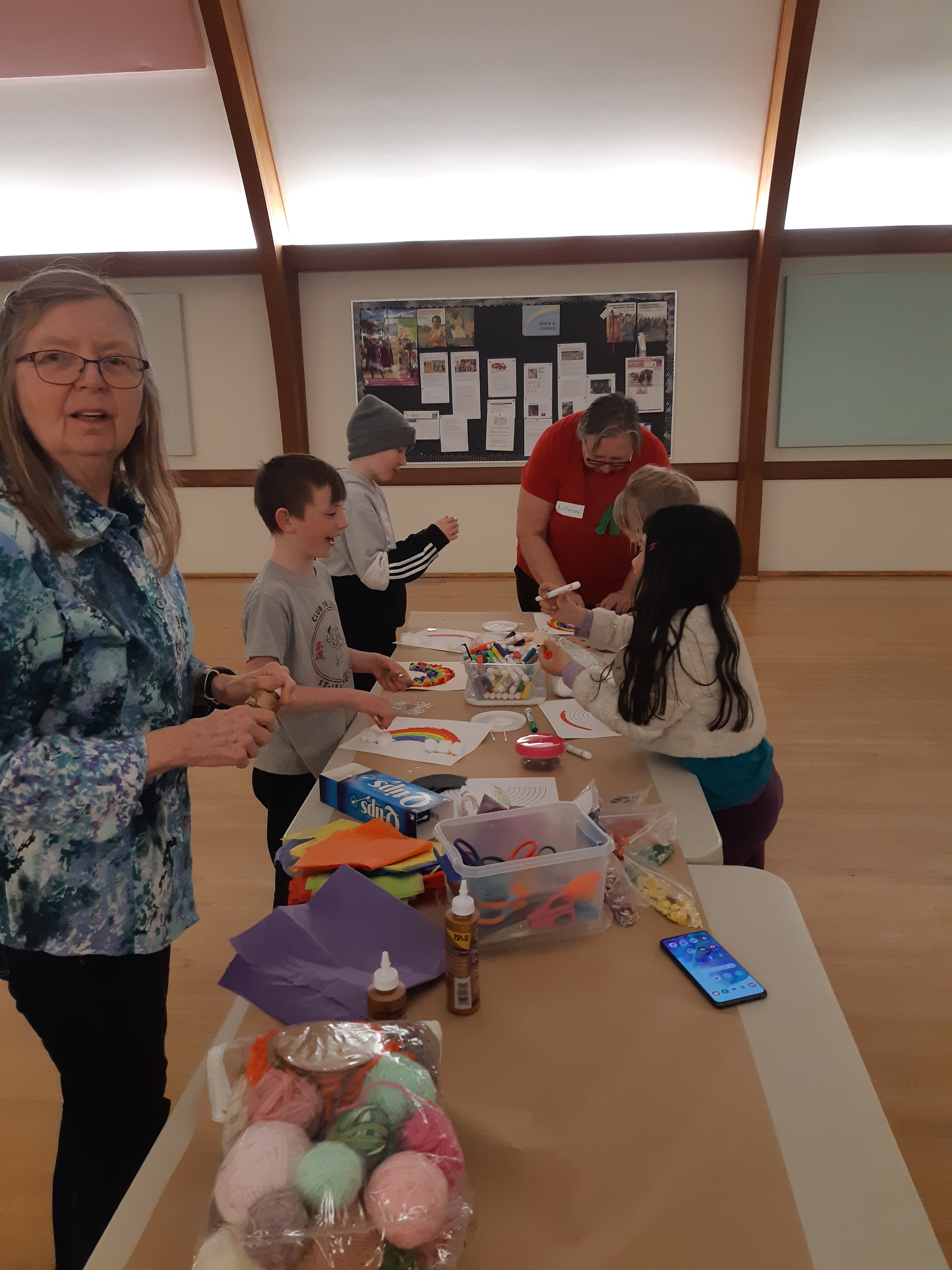 A small group of families gathered and celebrated St. Patrick’s Day. The children made mixed media rainbow art, heard a story about a lucky leprechaun, played games and decorated shamrock cookies.
