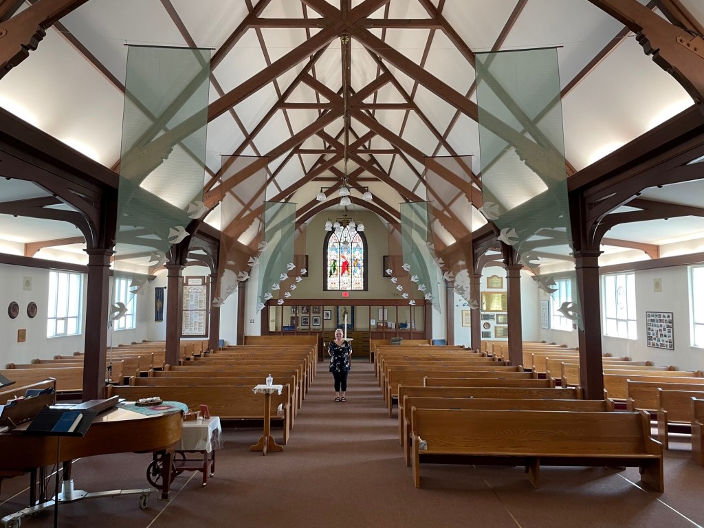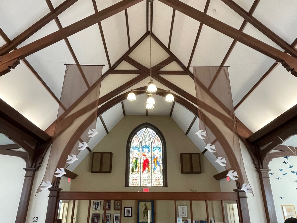 The dove hangings are back – freshened up, and hanging in the Cathedral. For the past several years Ordinary time has come and the original dove hangings were in no shape to be put up. Beautiful and fragile after many years in the hot summer Cathedral, it was time to retire them. We want to thank Sandra Sugden and the original dove team for the close to 20 years we got to enjoys the original banners.