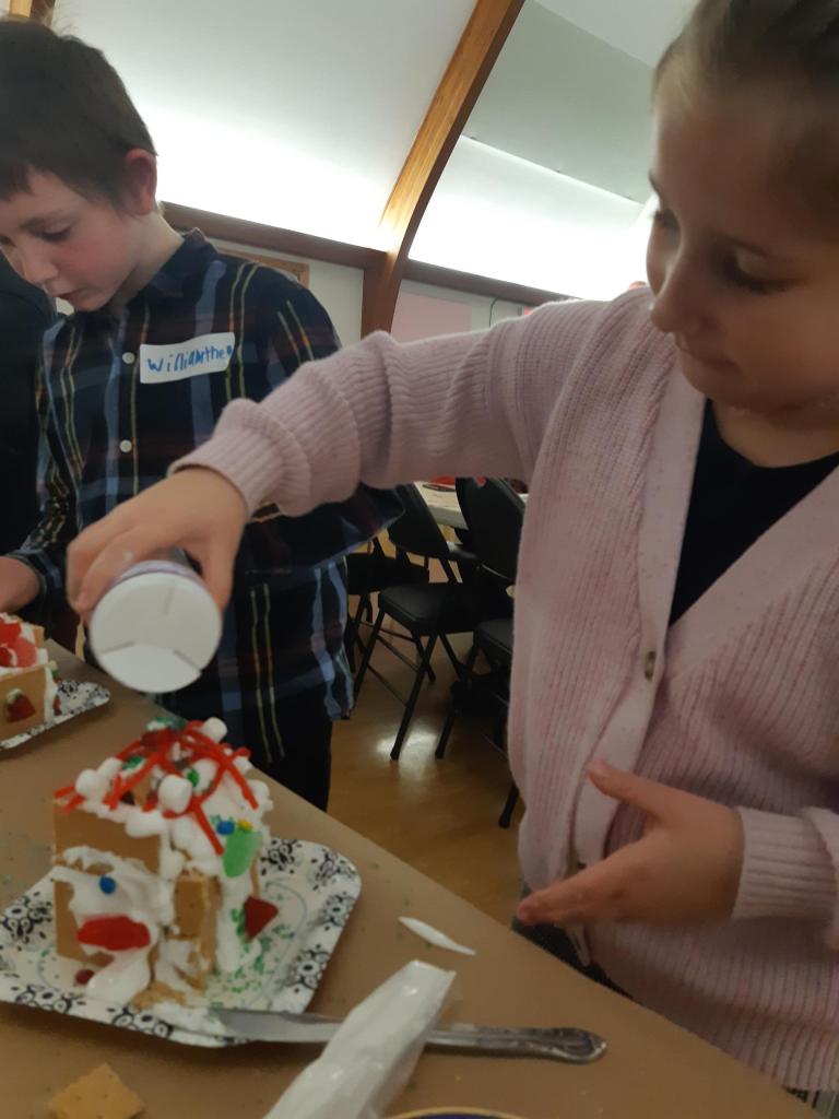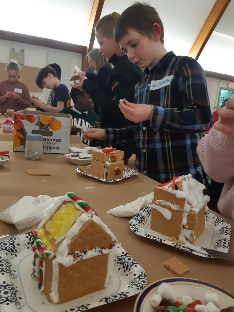 Then construction began on the Cookie Houses. They were built on the frame of a small milk carton. First graham wafers were “glued” with icing to the carton and then candies were added as decorations. Of course, not all the candies ended up on the houses! Watch the slide show below to see the progression.