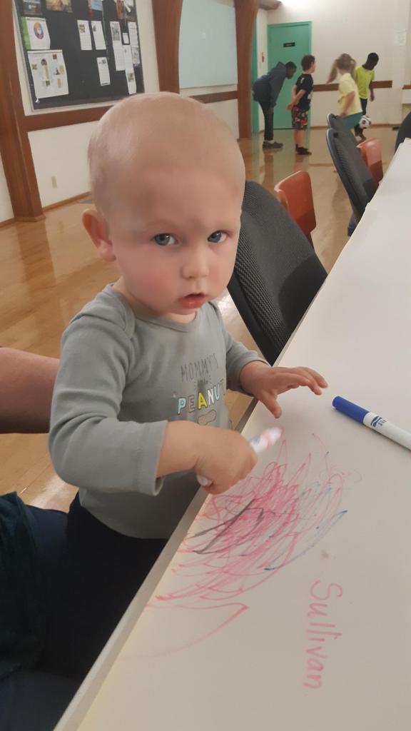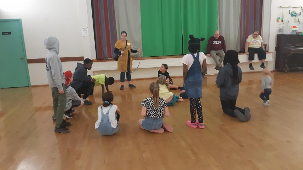 Six families including six children and nine youth attended the April 12th dinner and activities. After dinner, the activities started with a boisterous game of “Fruit Loop Tag” with all ages participating. Below is a photo of Melissa explaining the game which involved various sized hulu hoops. Once the game began, it was hard to capture the action!