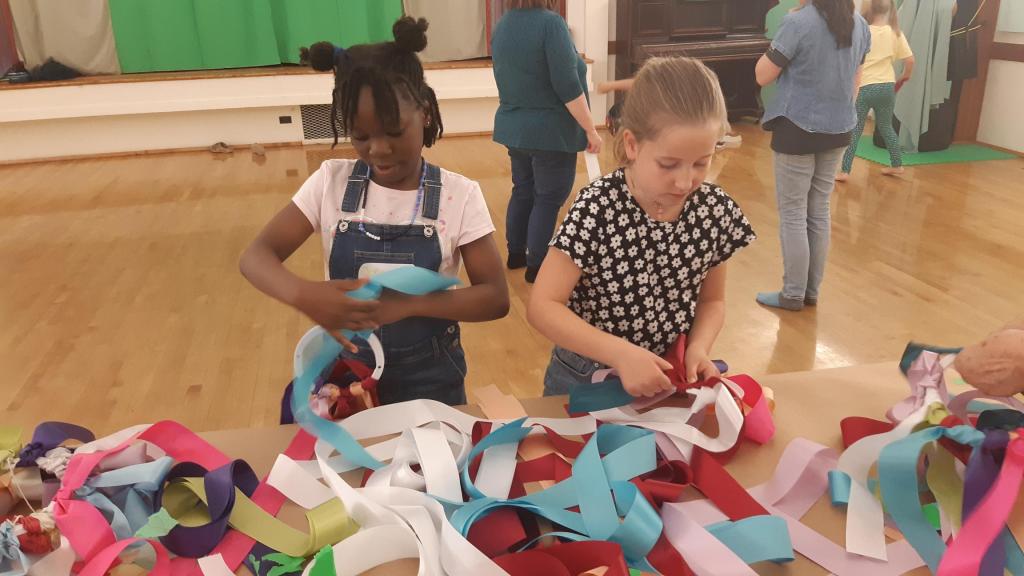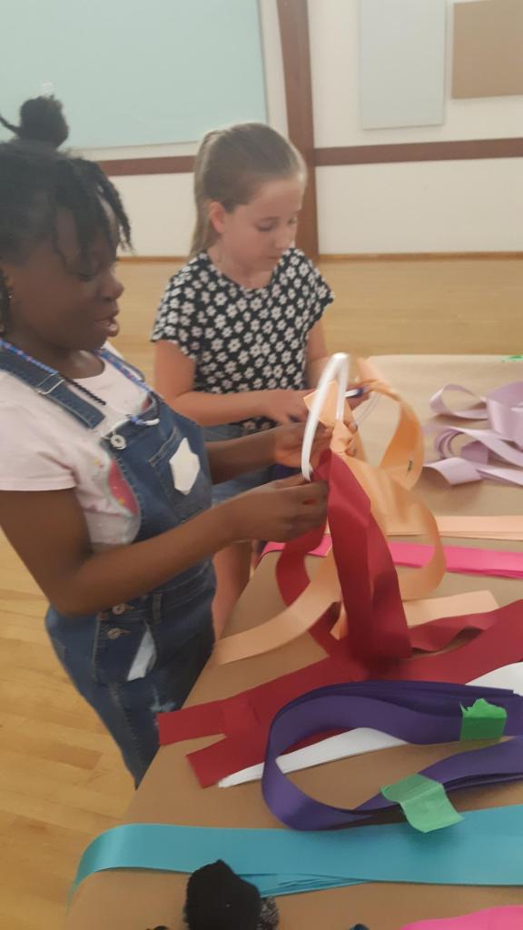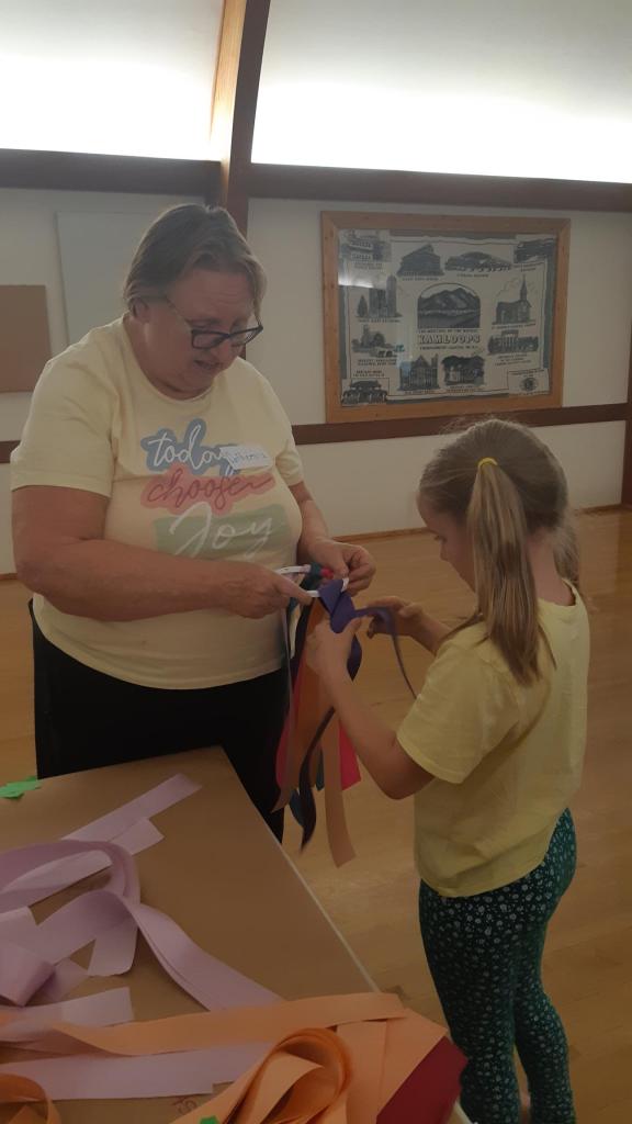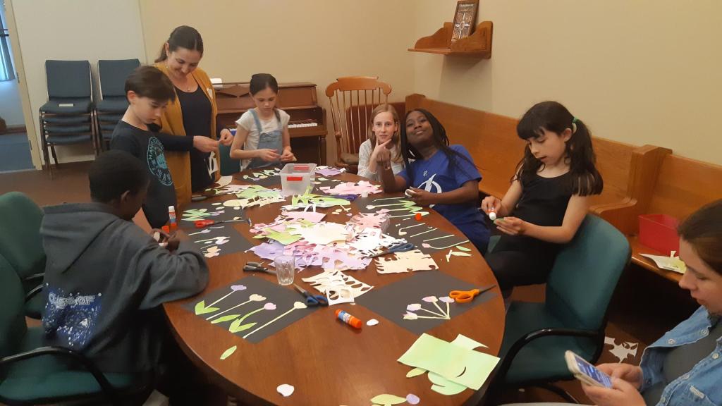 Then the group divided based on age, with the younger children hearing a story and then making a ribbon windsock and the older children making tulip pictures with Melissa.