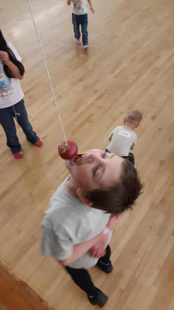 A second game involved trying to bite an apple suspended on a string without using hands.