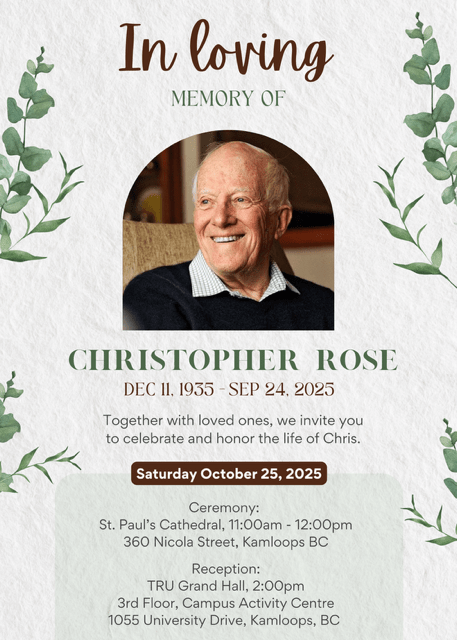 Chris Rose Bulletin 25Oct2025 with FB LinkDownload Hymns for Chris Rose Service 25Oct25 Web&FBDownload Share this: Click to share on X (Opens in new window) X Click to share on Facebook (Opens in new window) Facebook Like Loading... Leave a comment Cancel reply Δ Post navigation Previous Previous post: Friday Family Food and Fun – Hallowe’en Spiders and MasksNext Next post: Remembering Chris Rose