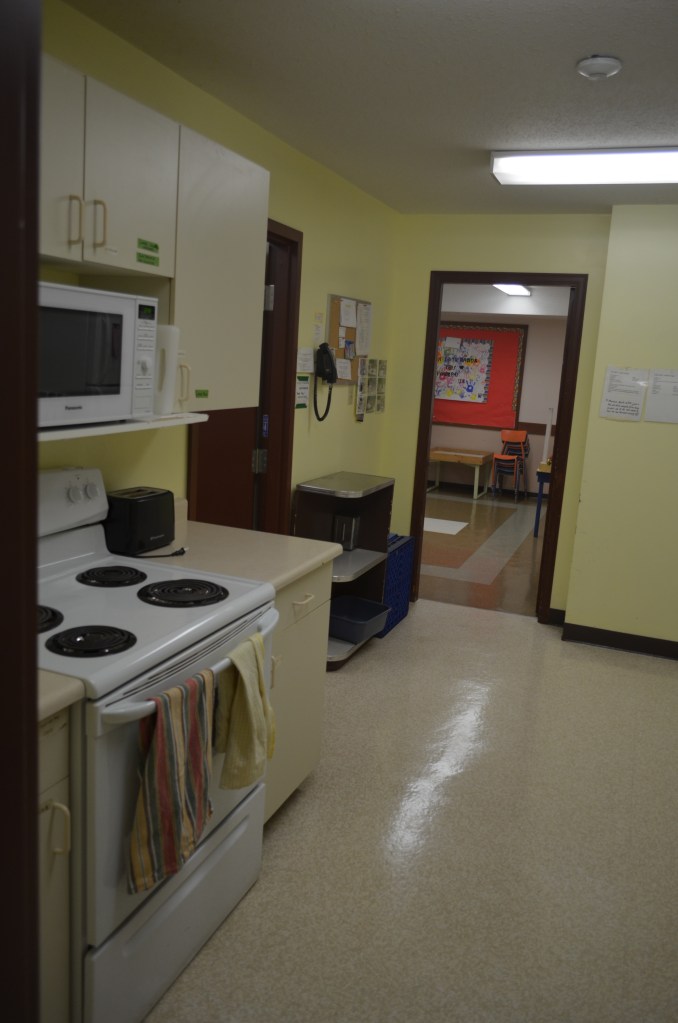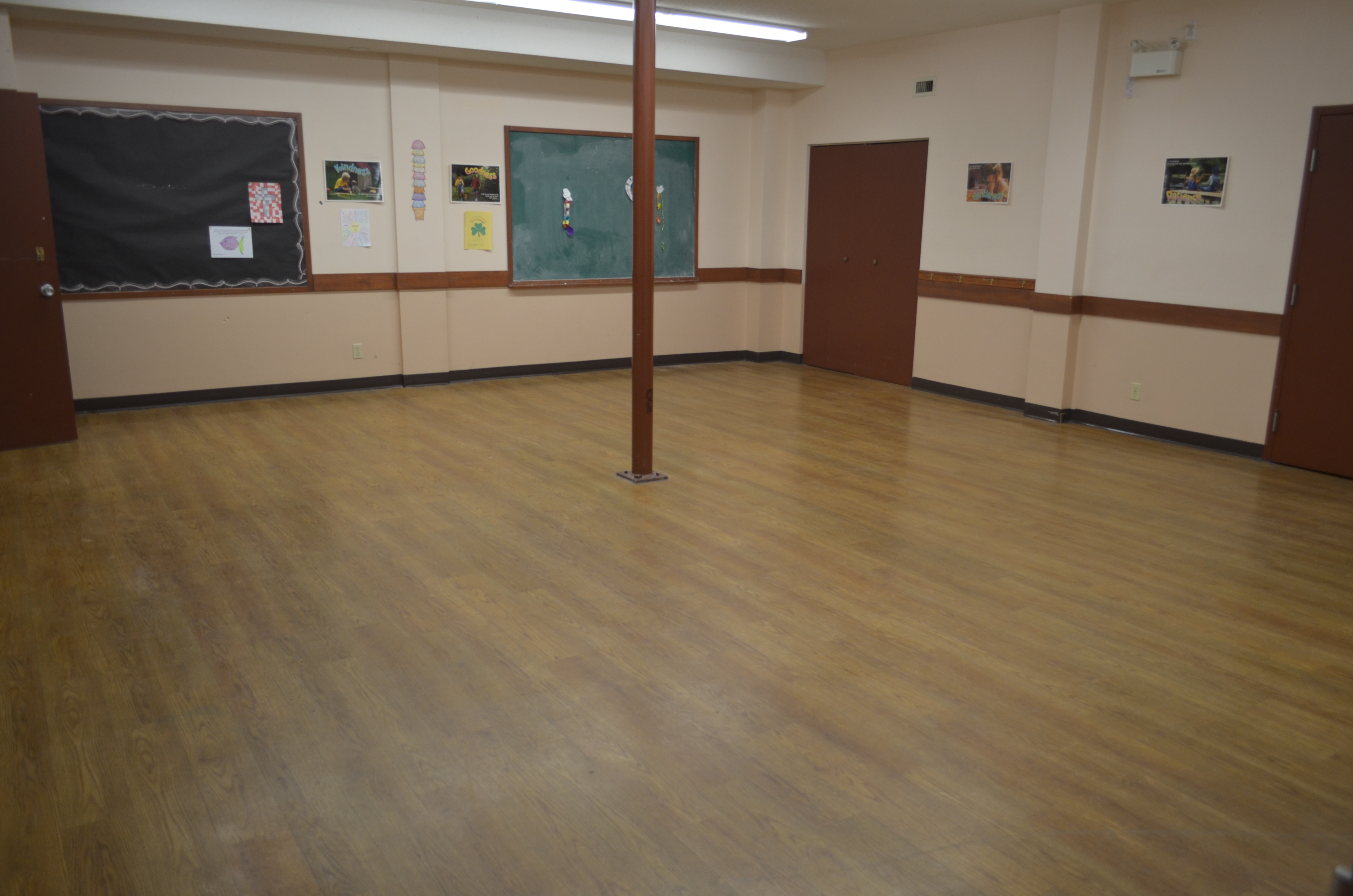 The Ruth room is located directly adjacent to the downstairs kitchen. It features linoleum flooring and can be set up with either children or adult size chairs and tables. It also has a wall mounted big screen TV.