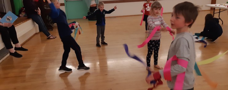 Five families attended our celebration of spring. We joined together for a meal followed by song, games and stories about spring and crafting colorful windsocks…